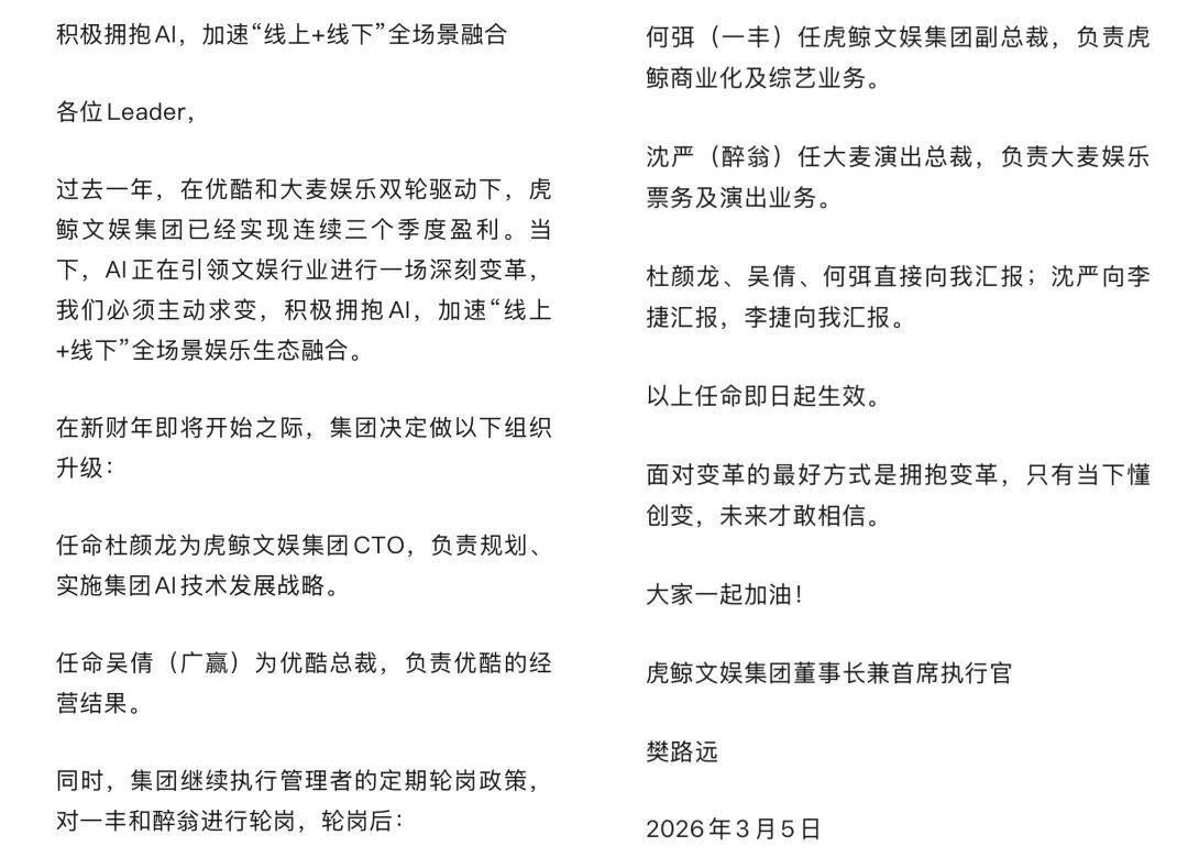 此前,虎鲸文娱集团董事长兼首席执行官樊路远向发出的内部邮件,明确指出要积极拥抱AI,任命杜颜龙为虎鲸文娱集团CTO,就是“负责规划,实施集团AI技术发展战略。”