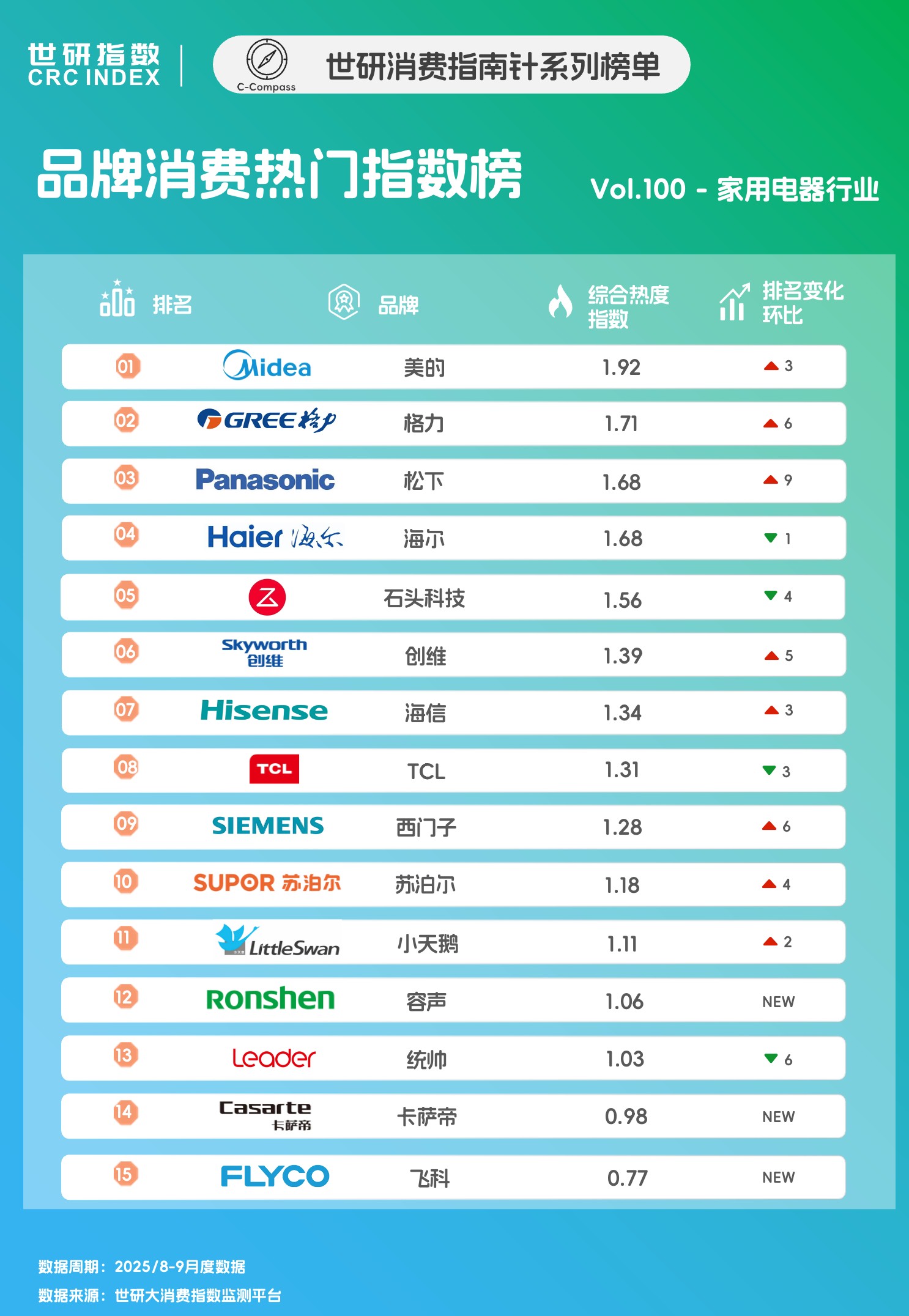本次监测周期内,美的、格力和松下分别以1.92、1.71和1.68的综合热度指数位列榜单Top3。